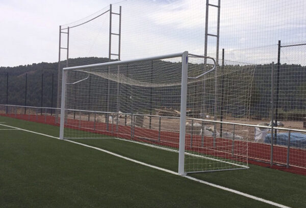 Marcos fabricados con tubo de aluminio extrusionado de sección oval de 120 x 100 mm o de sección redonda de 120 mm lacado en color blanco RAL 9010. Medidas reglamentarias: 7,32×2,44 m. Escuadras interiores para unión poste con el larguero de tubo de acero cuadrado de 60x60x2 mm cincadas, que proporcionan al marco una gran resistencia y durabilidad. Arquillos metálicos galvanizados en caliente con tirante lateral de refuerzo. Anclajes de aluminio de 500 mm y ganchos de poliamida para la red. Precio por juego (2 unidades).